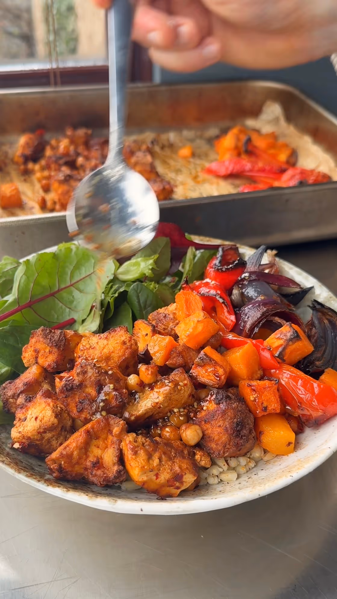 - Add the leeks to one side of a tray and the peppers and chillies to the other